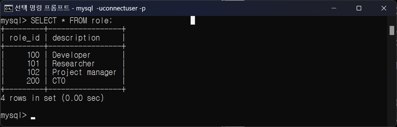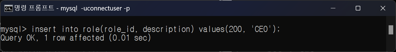 mysql> INSERT INTO ROLE(role_id, description) VALUES(200, 'CEO');