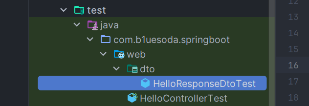 저는 지난 번에 만들었던 HelloControllerTest와 같은 위치에 dto패키지를 만들고, 거기에 HelloResponseDtoTest라는 테스트 클래스를 만들었습니다.