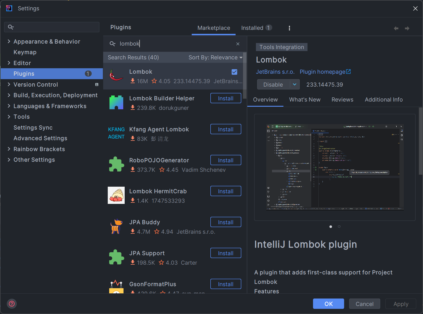 플러그인 Marketplace에 "lombok"을 검색해 설치를 진행해줍니다.