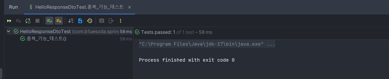 이제 이 Dto에 적용된 롬복이 잘 작동하는지 간단한 테스트 코드를 만들어 보겠습니다.