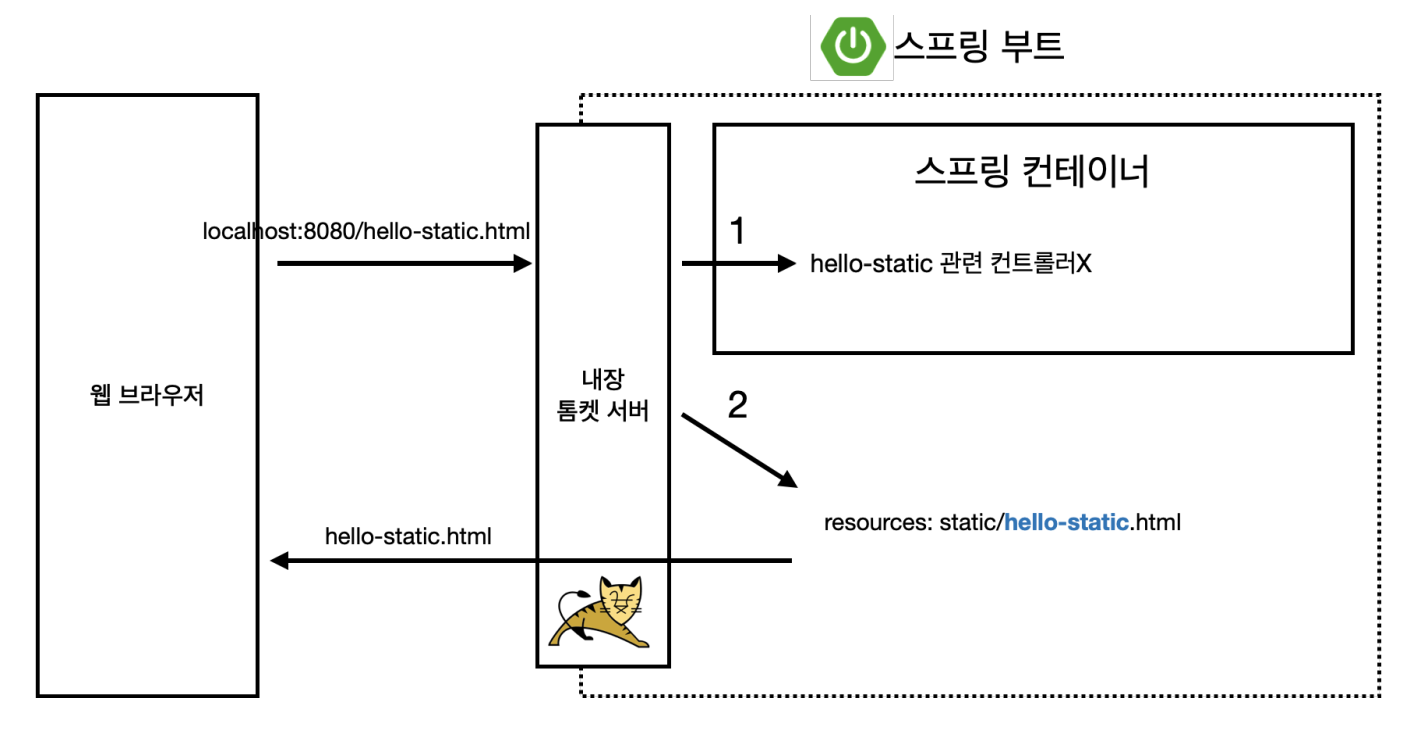 웹에서 localhost:8080/hello-static.html을 요청하면 내장되어있는 톰캣서버가 요청을 받고, 스프링 컨테이너에게 전달합니다.