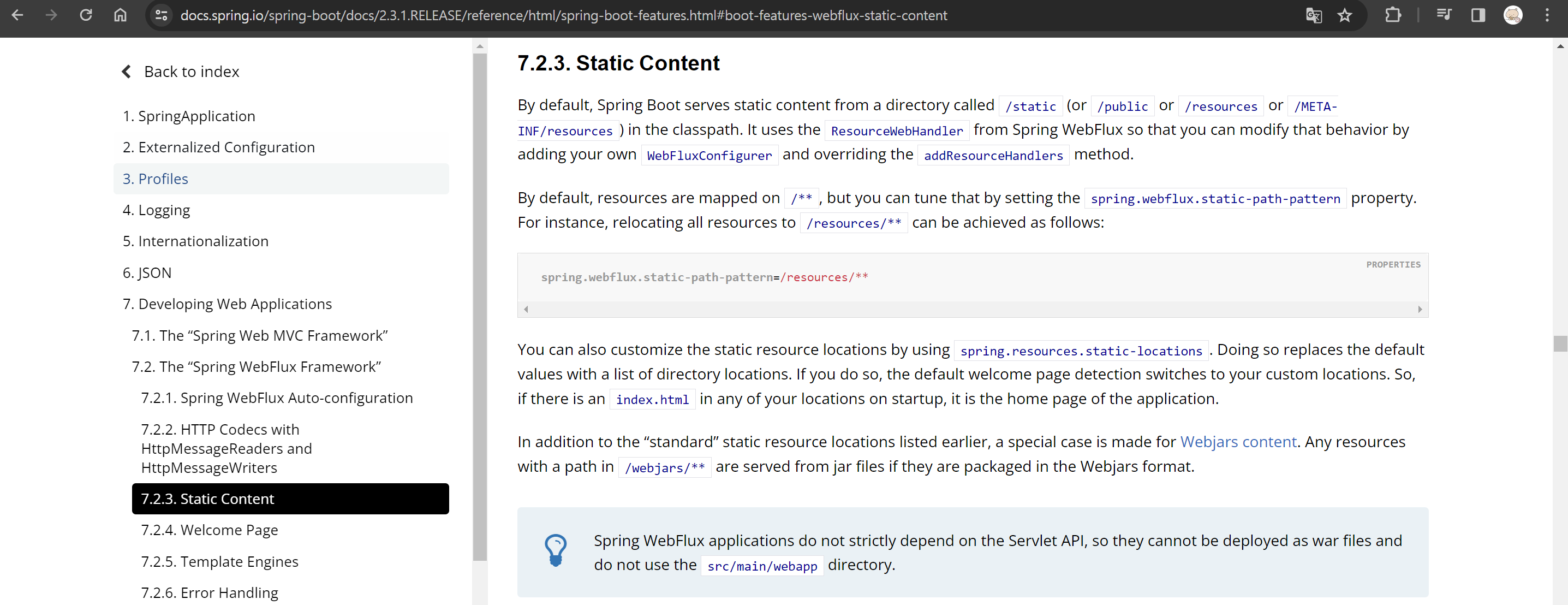 Spring Boot Features에 들어가 보면, 스프링 부트에서 정적 컨텐츠를 /static 디렉토리에서 불러온다고 적혀 있습니다.