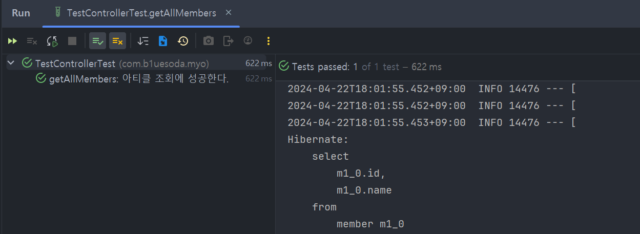 저는 id와 name을 가진 Member엔티티의 리스트를 최종적으로 반환하는 TestController를 이렇게 미리 만들어 놓았는데요, 이 클래스에 대한 테스트 코드를 만들어 보았습니다.