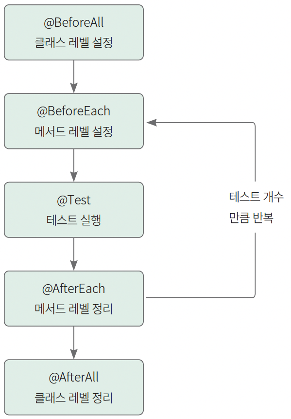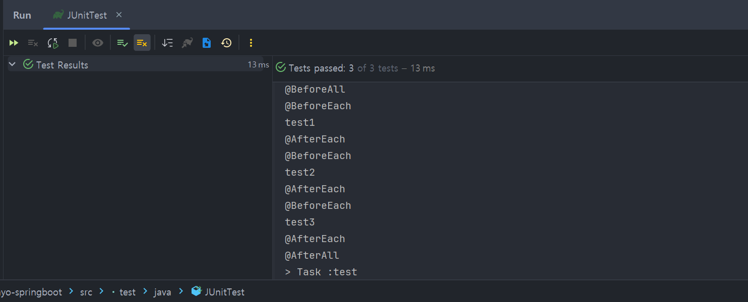 결과를 보면 @BeforeAll로 설정한 메서드가 먼저 실행되고, 그 이후에는 테스트 케이스 개수만큼 @BeforeEach→@Test→@AfterEach의 생명주기로 테스트가 진행되는 것을 볼 수 있습니다.