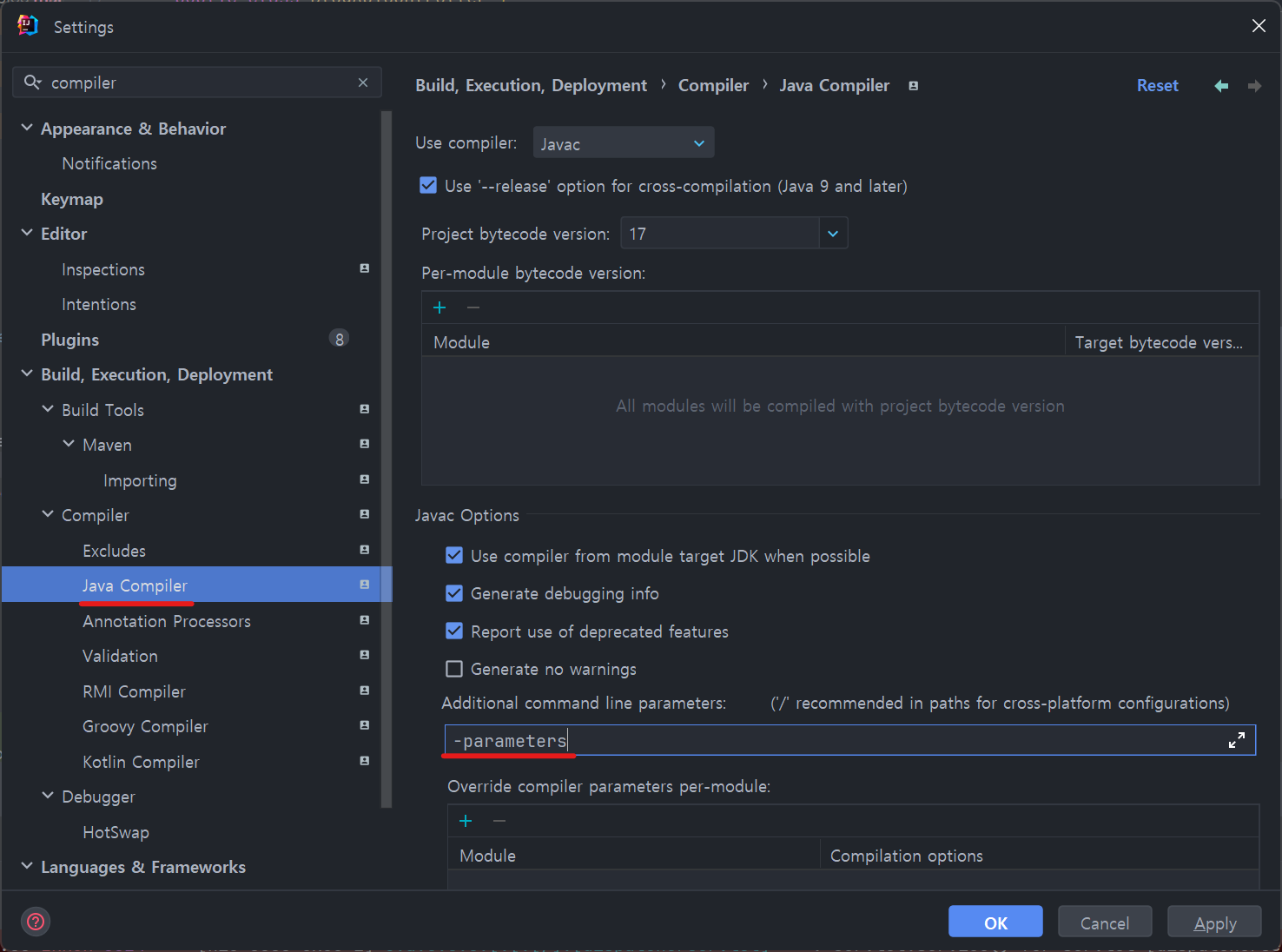 방법은, File > Settings > Build, Exception, Deployment < Compiler > Java Compiler위치에 Additional command line parameters 항목에 -parameters옵션을 추가해 주면 됩니다.