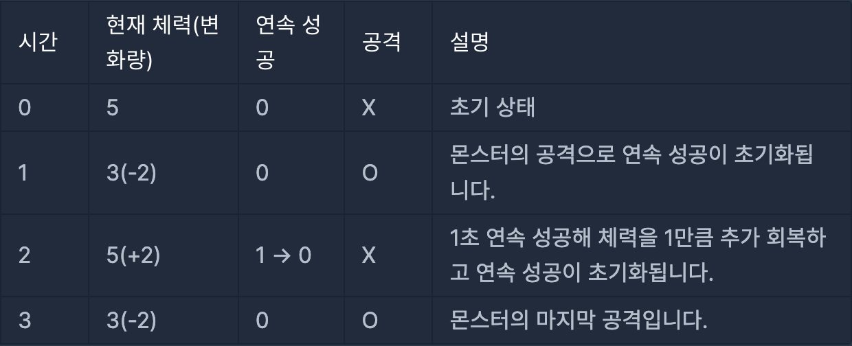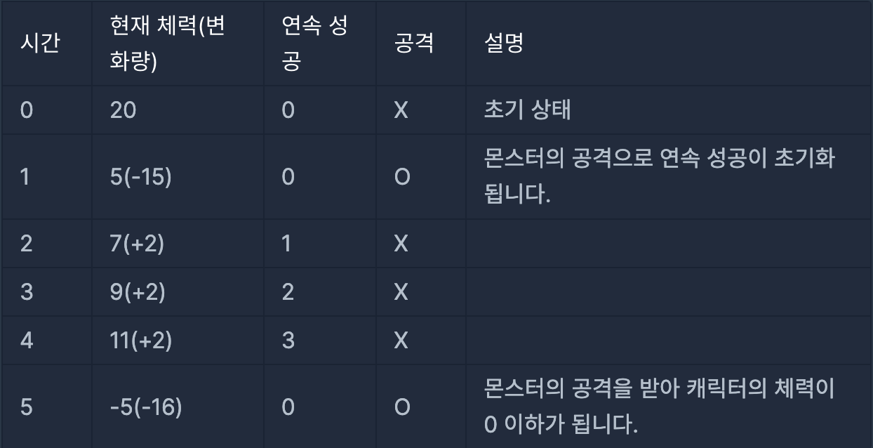 몬스터의 마지막 공격은 3초에 이루어집니다. 0초부터 3초까지 캐릭터의 상태는 아래 표와 같습니다.