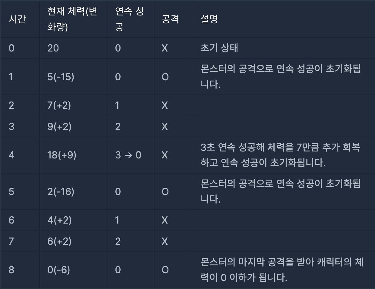 몬스터의 마지막 공격은 8초에 이루어집니다. 0초부터 8초까지 캐릭터의 상태는 아래 표와 같습니다.