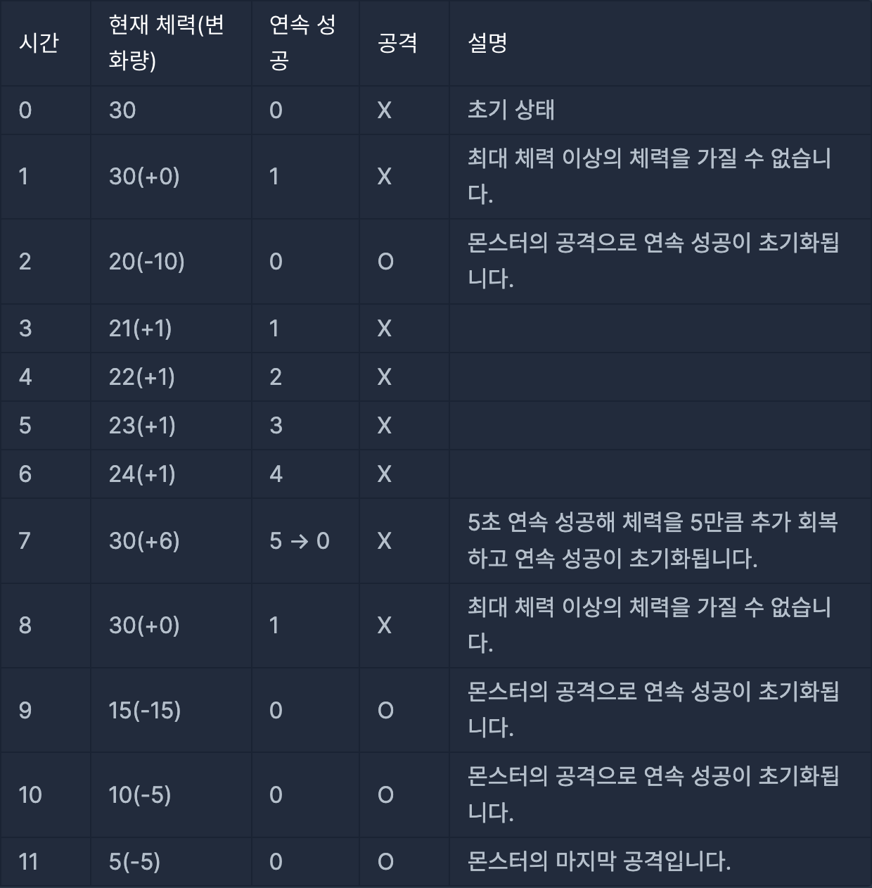 몬스터의 마지막 공격은 11초에 이루어집니다. 0초부터 11초까지 캐릭터의 상태는 아래 표와 같습니다.