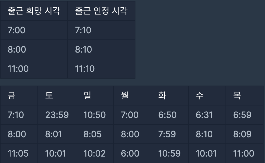 프로그래머스 사이트를 운영하는 그렙에서는 재택근무와 함께 출근 희망 시각을 자유롭게 정하는 유연근무제를 시행하고 있습니다. 제도 정착을 위해 오늘부터 일주일 동안 각자 설정한 출근 희망 시각에 늦지 않고 출근한 직원들에게 상품을 주는 이벤트를 진행하려고 합니다.