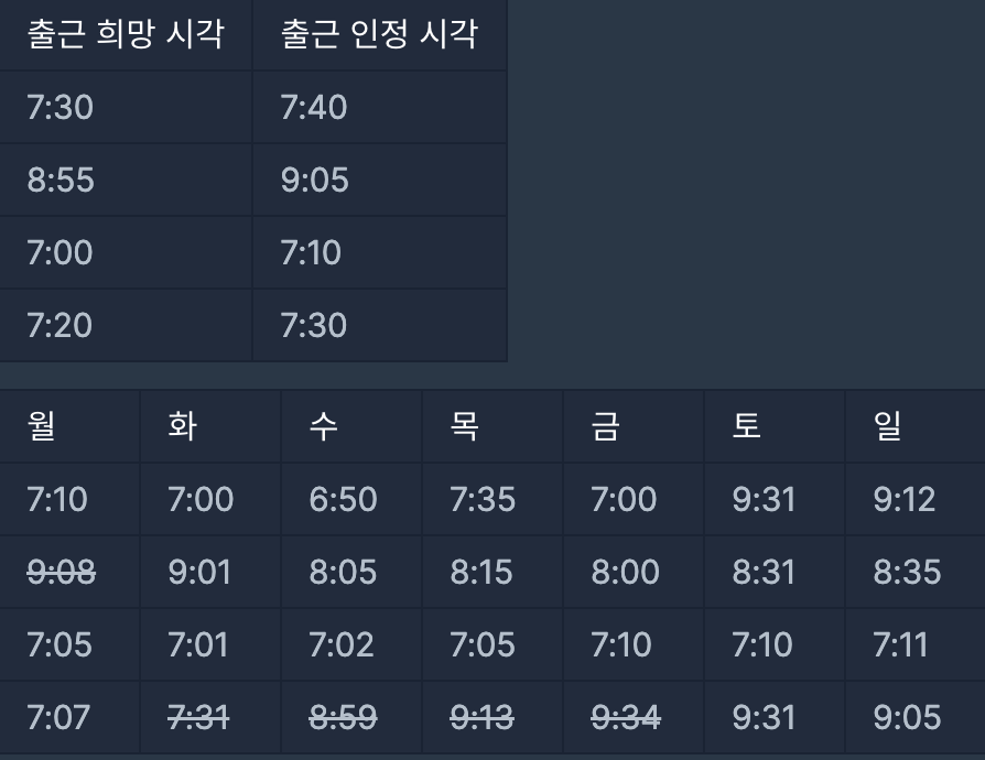 이벤트를 시작한 날은 월요일입니다. 직원 4명의 일주일 간 출근 시각을 나타내면 다음과 같습니다. 취소선으로 표시된 시각이 출근이 필요한 평일에 지각한 날입니다.