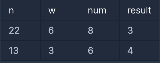 창고에 있는 택배 상자의 개수를 나타내는 정수 n, 가로로 놓는 상자의 개수를 나타내는 정수 w와 꺼내려는 택배 상자의 번호를 나타내는 정수 num이 매개변수로 주어집니다. 이때, 꺼내야 하는 상자의 총개수를 return 하도록 solution 함수를 완성해 주세요.