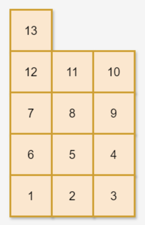 왼쪽에서 오른쪽으로 가면서 1번 상자부터 번호 순서대로 택배 상자를 한 개씩 놓습니다. 가로로 택배 상자를 w개 놓았다면 이번에는 오른쪽에서 왼쪽으로 가면서 그 위층에 택배 상자를 한 개씩 놓습니다. 그 층에 상자를 w개 놓아 가장 왼쪽으로 돌아왔다면 또다시 왼쪽에서 오른쪽으로 가면서 그 위층에 상자를 놓습니다. 이러한 방식으로 n개의 택배 상자를 모두 놓을 때까지 한 층에 w개씩 상자를 쌓습니다.
