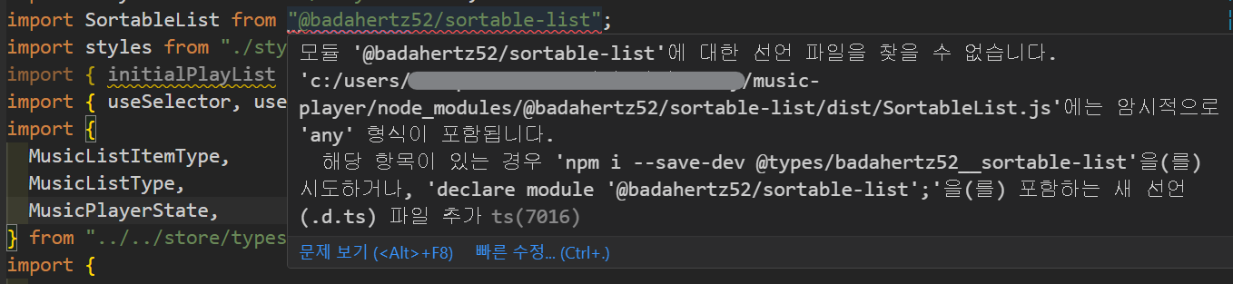 js 라이브러리를 typescript에서 사용할 경우 위의 사진처럼 해당 라이브러리명을 가진 모듈에 대한 선언 파일을 찾을 수 없다는 오류 메세지가 뜬다.