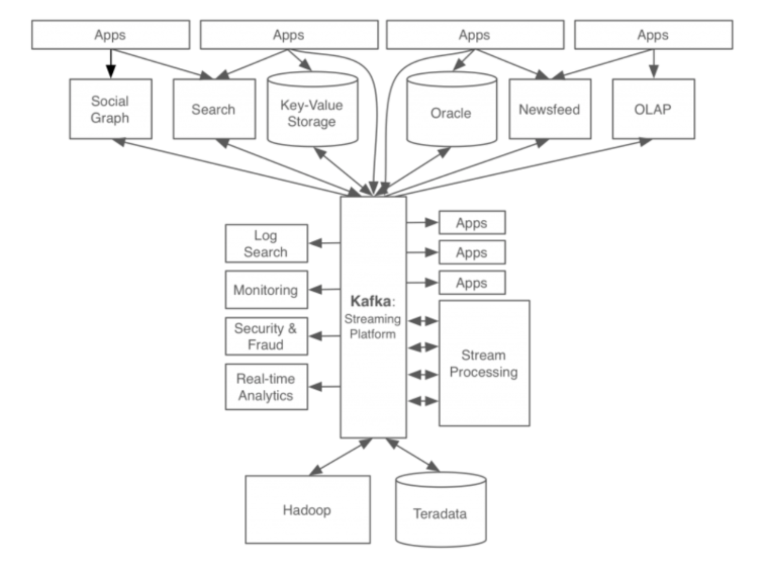 - 이렇게, 모든 어플리케이션에 대한 이벤트 및 데이터의 흐름을 중앙관리를 할 수 있는 Kafka를 개발