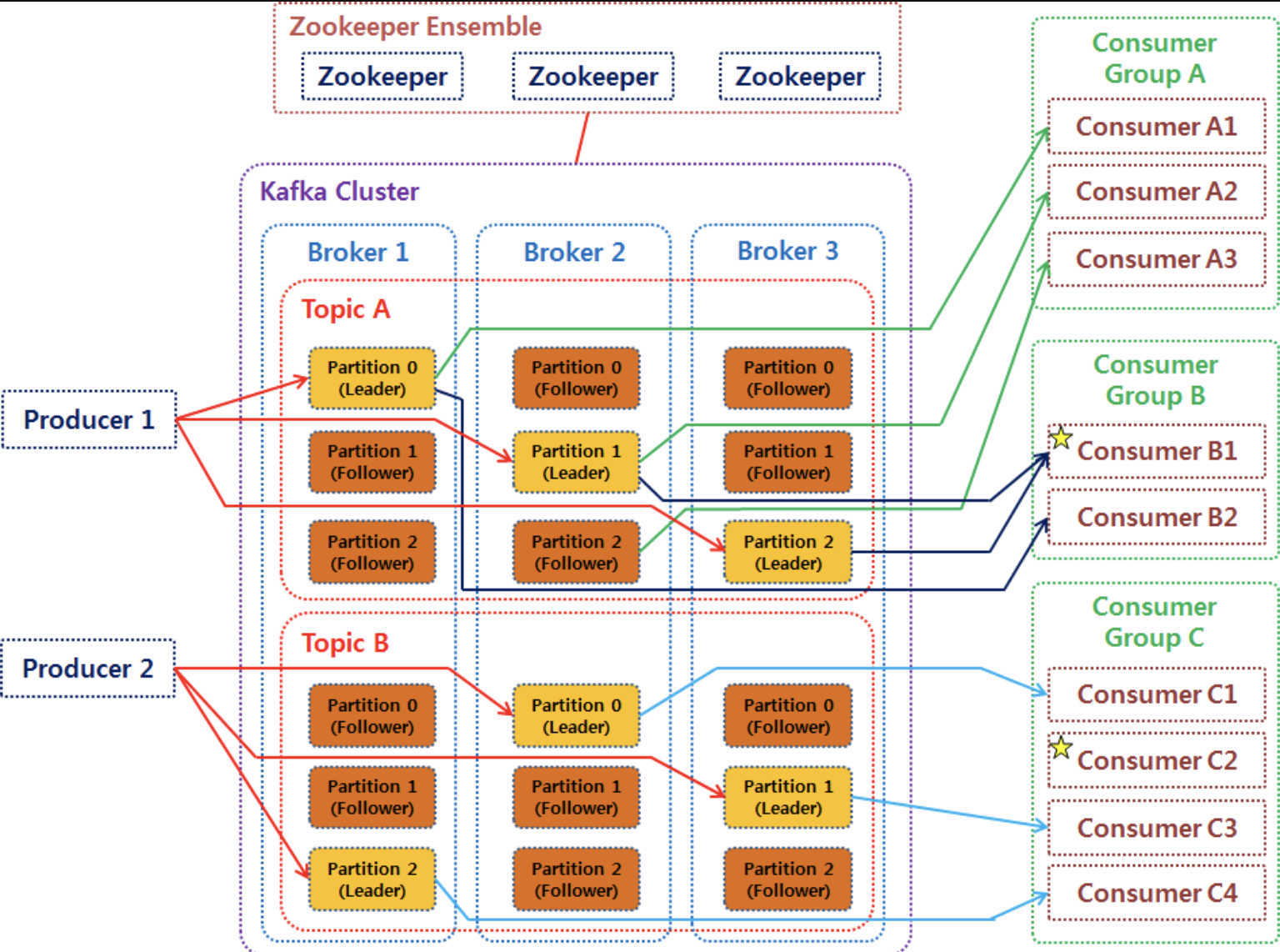 - 2개의 파티션은 각각 하나의 컨슈머에 할당되면서 컨슈머 그룹B에 있는 하나의 컨슈머는 어떤 파티션도 할당받지 못하는 상태가 됨