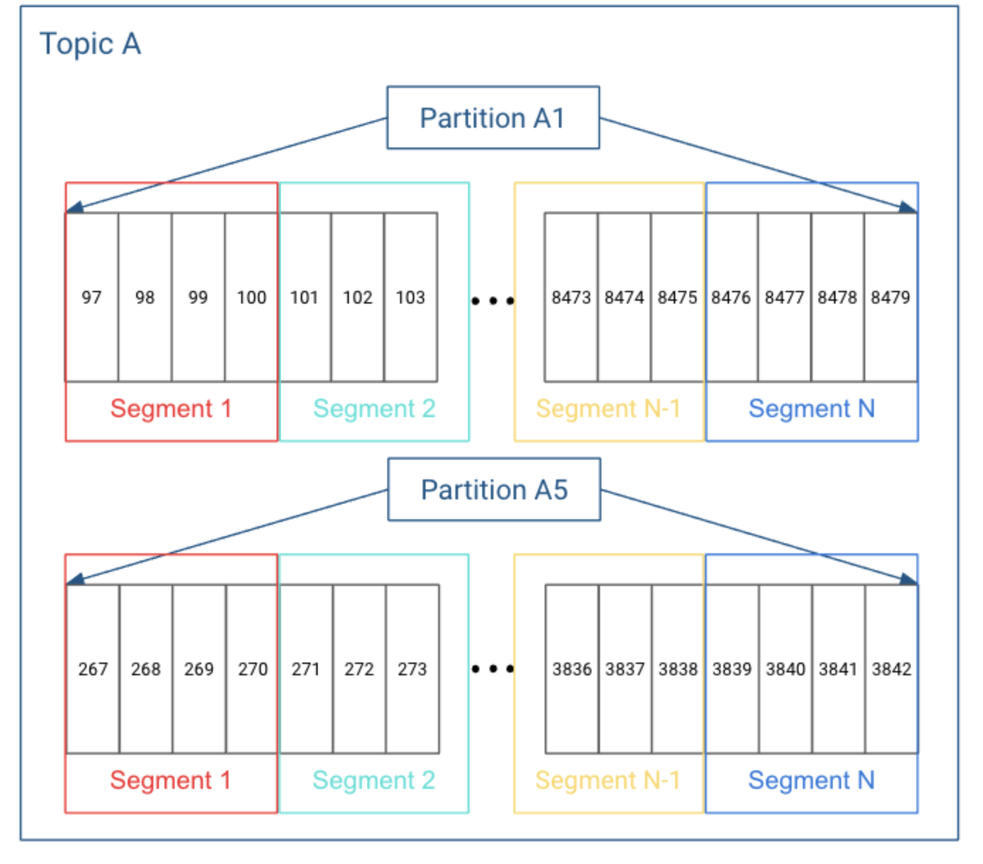 - 각 레코드는 특정 토픽과 파티션에 속하며, 세그먼트 내에 저장된다.