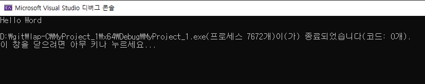 앞에서 작성한 코드를 이제 출력해봅시다. printf()를 작고 소괄호 안에 출력하고 싶은 내용을 ""(큰따옴표)사이에 넣으면 해당 내용이 출력이 됨. 맞는지 확인을 하시고 싶으면 디버그 -> 디버그 하지 않고 시작을 클릭 단축기 (Ctrl + F5)선택 그 전에 꼭 저장하고 실행!