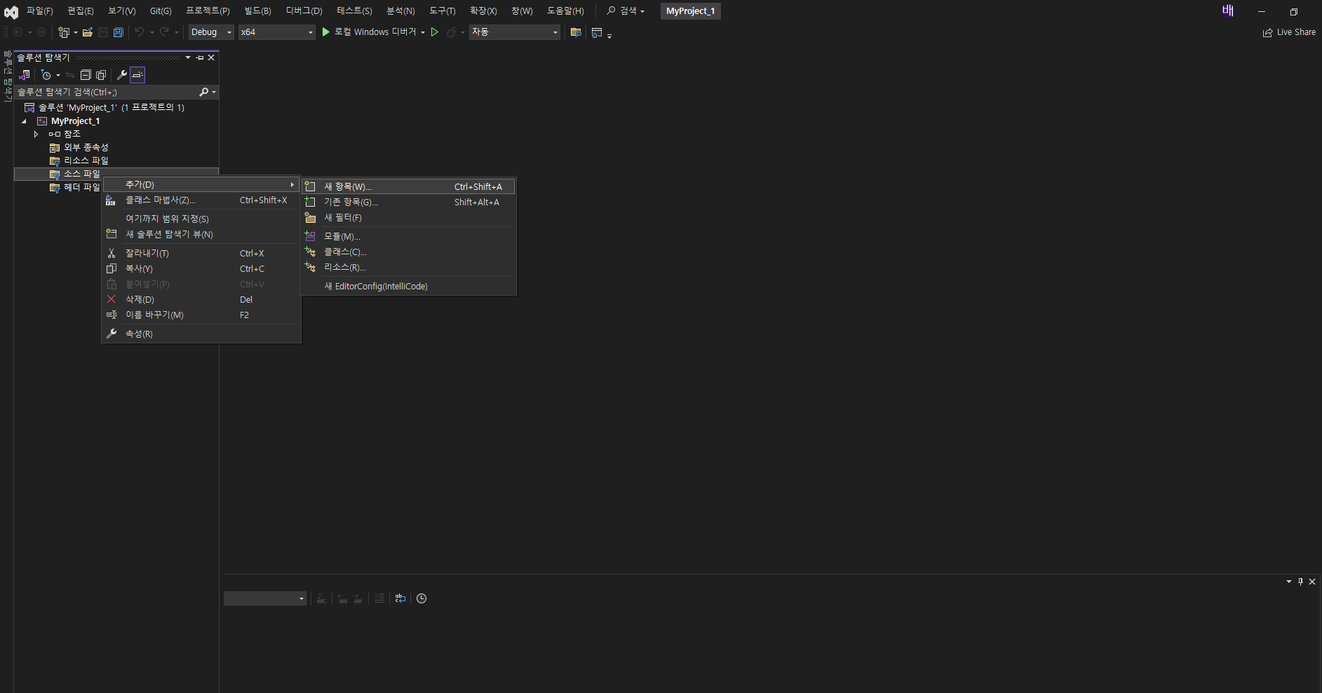 소스파일 마우스 오른쪽 버튼을 클릭하여 파업메뉴가 나오면 추가 -> 새 항목 클릭.