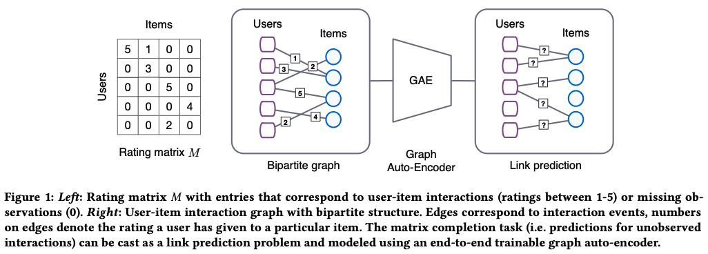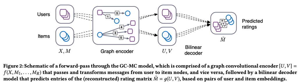 유저-영화 평점 행렬이 있을 때 기존 평점을 기반으로 message passing function을 사용해서 아직 평가가 없는 유저-영화 쌍의 예상 평점을 계산한다.