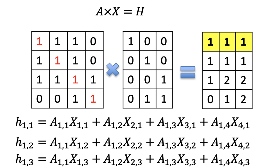 가장 오른쪽에 있는 행렬이 곱한 결과이다. 곱한 후 [점 1]의 feature를 보자. [점 1] 자신과 이웃인 [점 2], [점 3]의 feature를 합한 값임을 알 수 있다. [점 4]는 [점 1]의 이웃이 아니므로 [점 4]의 feature는 더해지지 않았다. 인접행렬의 성질에 의해 곱한 결과가 자신과 이웃의 feature 합이 되었다.