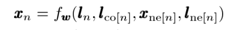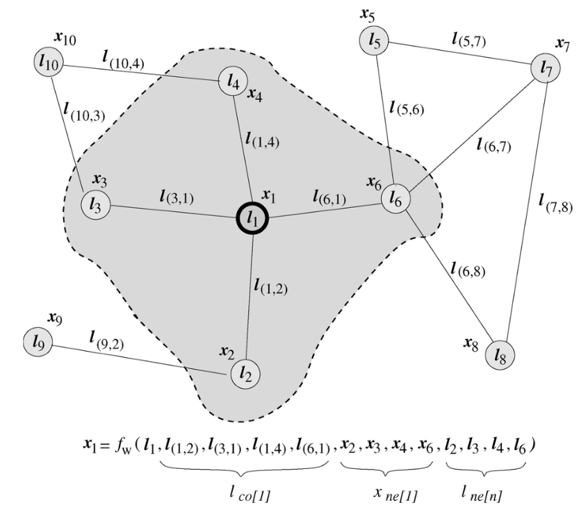 여기에서, l{n}는 점 n의 feature, l{co[n]}은 점 n과 연결된 선들의 feature, l{ne[n]}은 점 n과 연결된 점들의 feature, x{ne[n]}은 점 n과 연결된 점들의 상태를 의미한다.