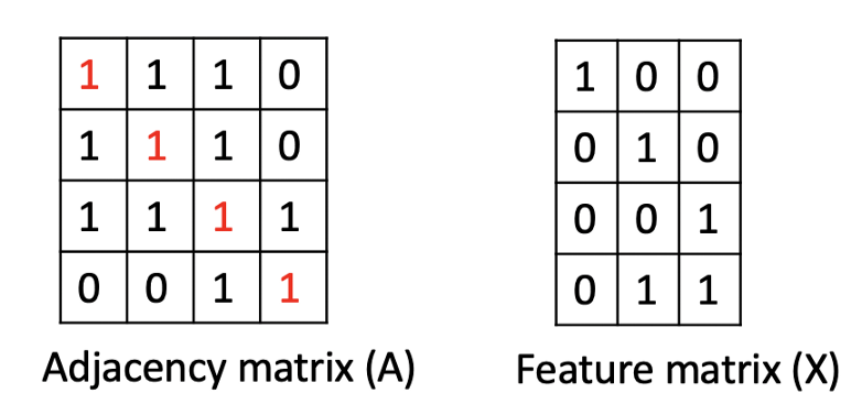 점이 4개인 그래프를 생각해보자. 위의 그림처럼 연결되어있고 점 옆에 있는 수들은 그래프의 feature를 나타낸다. 아래처럼 대각선을 1로 채운 인접행렬과 feature matrix를 쉽게 얻을 수 있다.
