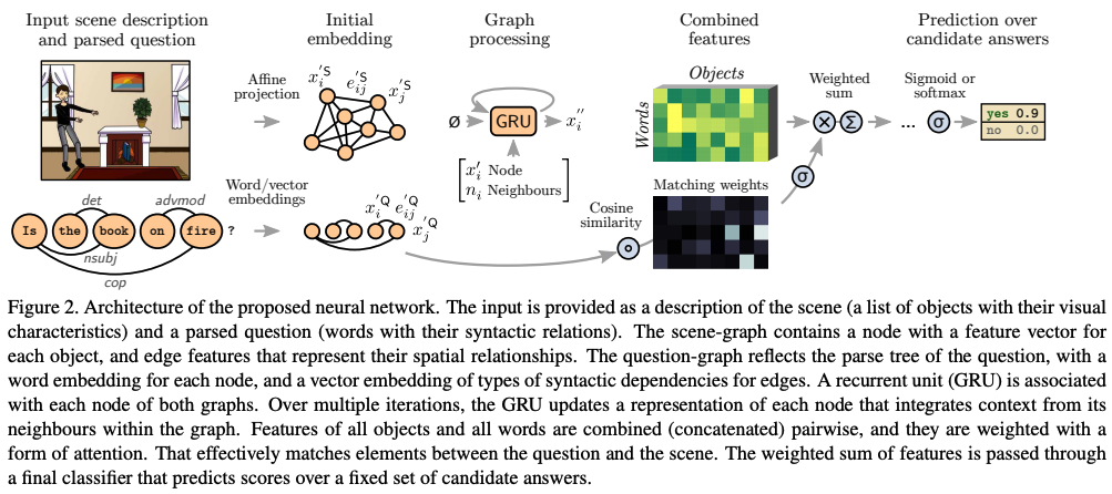 Visual Question Answering 문제에도 그래프를 도입하여 성능을 끌어올릴 수 있다. 아래 그림에 간략히 요약되어 있는데, 장면과 질문으로부터 각각 scene graph와 question graph를 만든 후 pooling과 GRU를 적용한다.