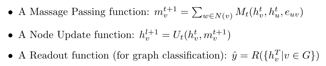따라서, Spectral Convolutional Network와 Spatial Convolutional Network는 다른 내용을 기초로 하고 있지만 비슷한 연산 과정을 거친다. 현재 대부분의 Convolutional GNN이 이런 식이다. 점의 정보를 공유하고 업데이트를 하는데 어떻게 전달할 것인지에 대한 연구가 많이 진행되고 있다. 어떻게 전달할지 정의하는 함수를 message-passing 함수라고 한다. ‘Neural Message Passing for Quantum Chemistry’에서 아래 세 가지 함수를 정의하여 GNN을 Quantum Chemistry에 적용하는 연구를 했다. 자세한 정의는 생략하지만 첨자와 기호를 보면 대략 어떤 식인지 추측할 수 있다.