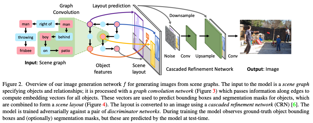 위에서 언급한 작업의 반대되는 작업도 할 수 있다. 기존 이미지 생성 방법은 Generative Adversarial Network이나 Autoencoder를 사용하였다. 아래 그림의 방법을 사용하면 scene graph로부터 이미지를 생성할 수 있다.