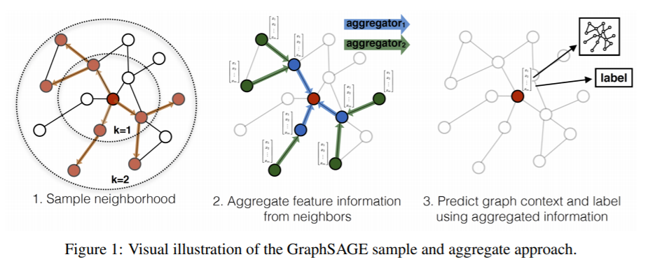 가운데 빨간 색 노드가 우리가 뽑은 배치에 들어간 노드라고 한다면, 이 노드가 B^2에 속한 노드가 될 것입니다. 이 노드의 Neighbor들을 샘플링한 것이 B^1이 되고, 다시 B^1에 속해있는 노드들의 Neighbor를 모은 것이 B^0가 됩니다. 따라서 어떠한 노드가 주어졌을 때, 그 노드와 바로 연결되어 있는 노드가 k=1에 속한 노드가 되고, k=1에 있는 노드들과 연결되어 있는 노드들이 k=2에 속한 노드가 되는 것이죠. 결과적으로 k=2에 속한 노드를 이용해 k=1에 속한 노드들의 feature를 구하고, 이를 이용해 최종적으로 우리가 원하는 노드의 feature를 구하게 되는 것입니다.
