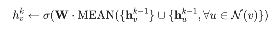 입력으로 주어진 Depth만큼, 계속해서 feature를 학습해나가게 됩니다. 가장 먼저 주변 노드들의 정보를 모아 AGGREGATE 함수로 처리하고, 이렇게 얻은 h를 정점의 이전 상태 정보와 합쳐주고 Weight matrix
