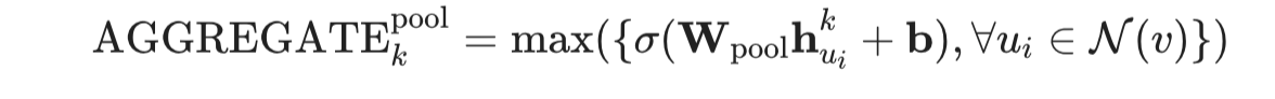 마지막 Aggregator로 Pooling Aggregator가 있습니다. 순서와 상관없으며, 학습이 가능하다는 장점이 있습니다. 이웃의 feature들이 각각 fully-connected layer에 입력으로 주어지게 됩니다.