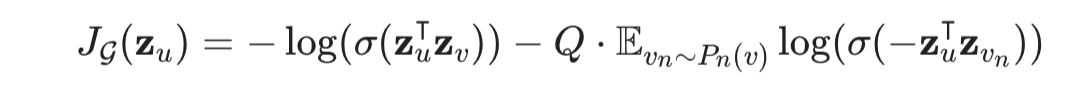 v는 u의 이웃하는 노드들이라고 생각하면 되며, P_n은 Negative sampling distribution을 의미합니다. 결국 이웃하는 노드들은 서로 비슷한 값을 가지게 만들고, 그렇지 않은 노드들은 다른 값을 가지도록 하는 것이 목표가 됩니다. 이때 위의 Loss를 Supervised한 세팅으로 바꾸는 것 - 이를테면 Cross Entropy - 도 가능합니다.