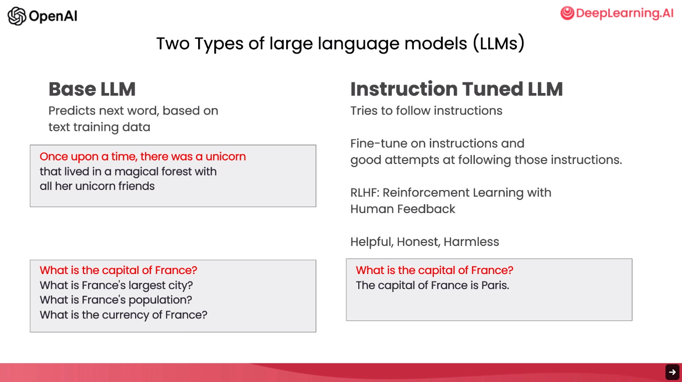 기존의 Base LLM은 입력에 대해 비슷한 유형의 텍스트를 생성하는 반면, Instruction Tuned LLM은 RLHF(사람의 피드백을 통한 강화학습)을 통해 입력에 대한 답변을 생성합니다.