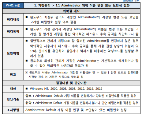 만약 '취약'이 나왔다면 Administrator의 계정의 이름을 바꾸고 보안성이 있는 비밀번호를 설정해야합니다.