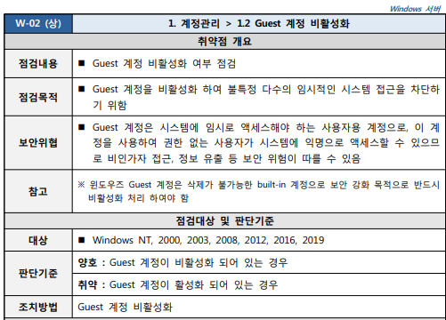 만약 '취약'이 나온다면 Guest 계정을 비활성화 해야합니다.