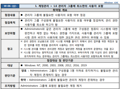 만약 Administrator 그룹에 불필요한 계정이 존재할 경우 '취약'이 출력됩니다.