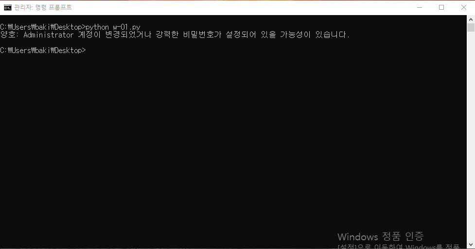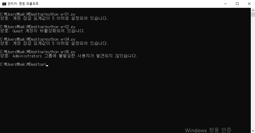 위 코드를 통해 Windows 서버의 Administrator 계정 이름이 변경되었거나 강력한 비밀번호가 설정되었는지 여부를 파이썬 코드를 통해 자동으로 점검할 수 있습니다.