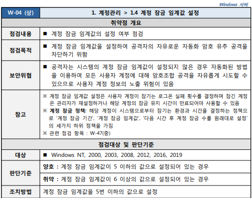 만약 '취약'이 나온다면 계정 잠금 임계값을 5 이하로 내려주어야합니다.