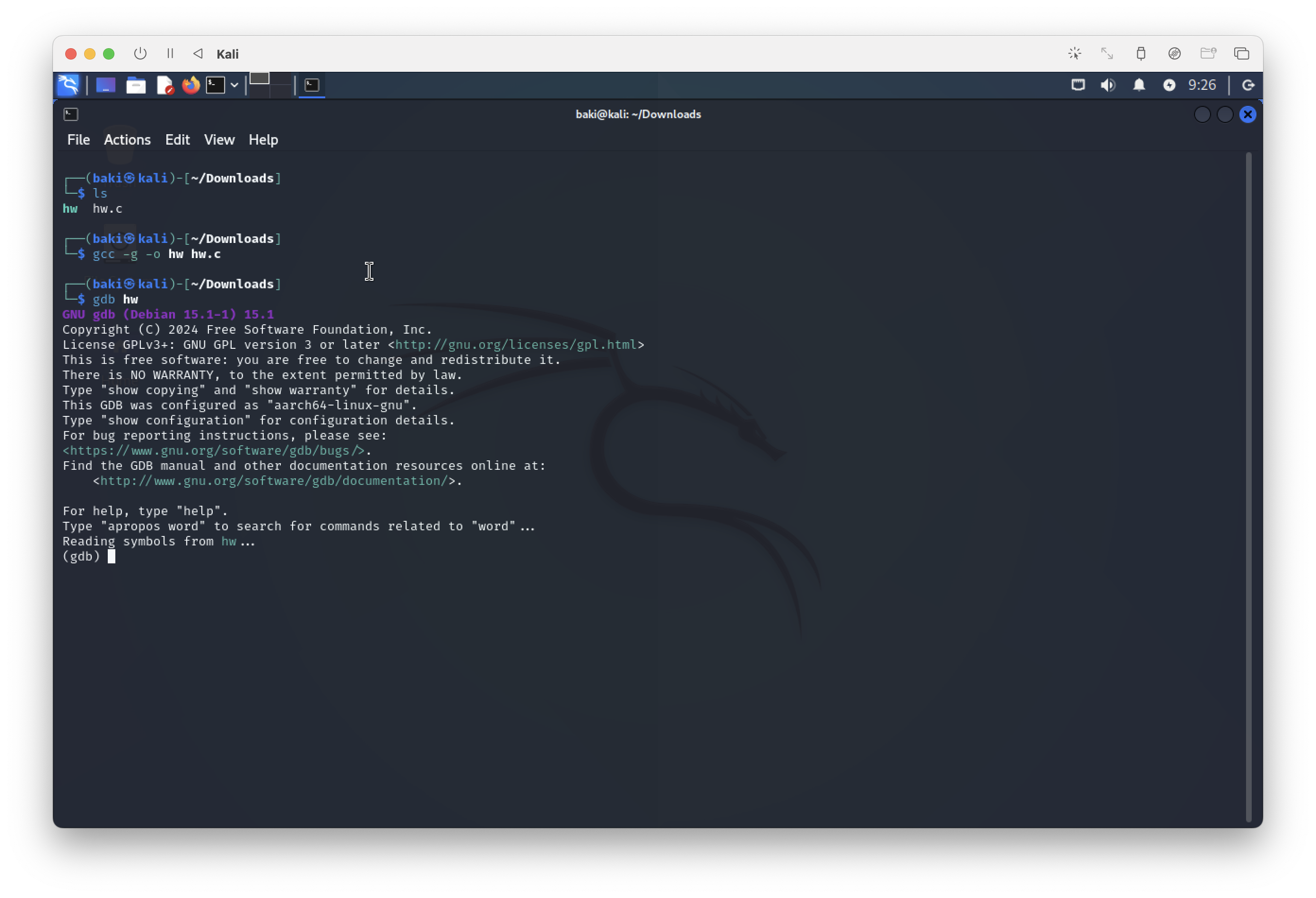 먼저 디버깅을 하기 전 gcc를 통해 컴파일을 진행하였고 hw.c는 교수님이 올려주신 파일을 이용하였다.