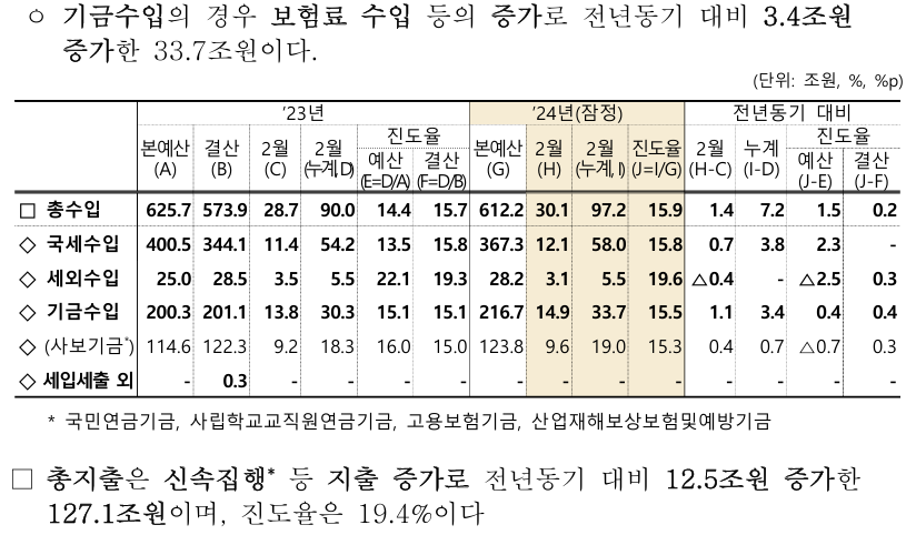 ㅇ 기금수입의 경우 보험료 수입 등의 증가로 전년동기 대비 3.4조원