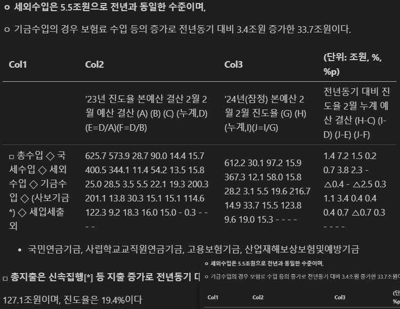 ||’23년 진도율 본예산 결산 2월 2월 예산 결산 (A) (B) (C) (누계,D) (E=D/A)(F=D/B)|’24년(잠정) 본예산 2월 2월 진도율 (G) (H) (누계,I)(J=I/G)|전년동기 대비 진도율 2월 누계 예산 결산 (H-C) (I-D) (J-E) (J-F)|