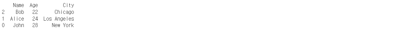 - 다음과 같은 DataFrame이 주어졌을 때, 'Age' 컬럼을 기준으로 오름차순으로 정렬하세요.