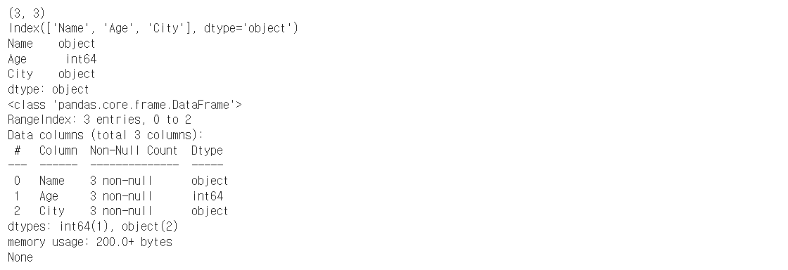 - Pandas DataFrame에서 총 row 개수, column 이름, 각 column의 데이터 타입을 출력하세요.