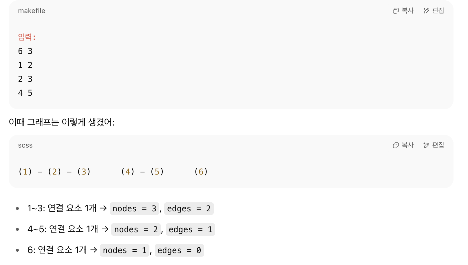 연결 요소마다 노드 수와 간선 수를 세고, 간선의 개수 = 노드 -1 인지 확인.