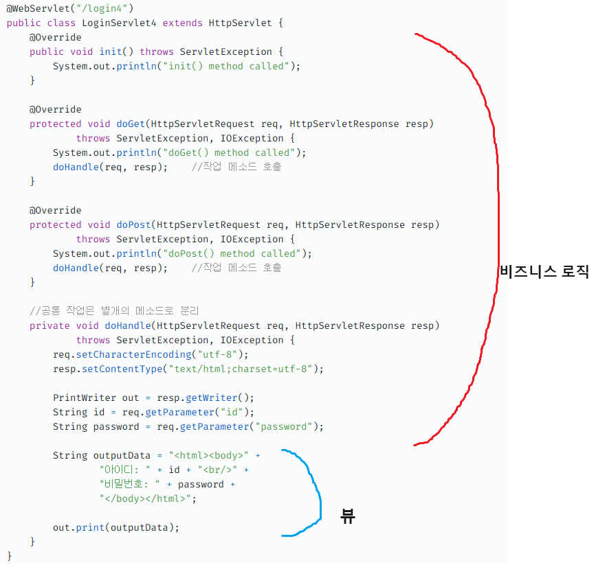 초창기 웹은 상대적으로 복잡하지 않은 구조를 갖기 떄문에 하나의 소스 코드 파일 내에 뷰(HTML), 로직(Java) 등이 혼재되어 있었습니다. 다음 서블릿 코드를 보면 하나의 소스 코드 파일에 뷰와 비즈니스 로직이 혼재해 있음을 볼 수 있습니다.