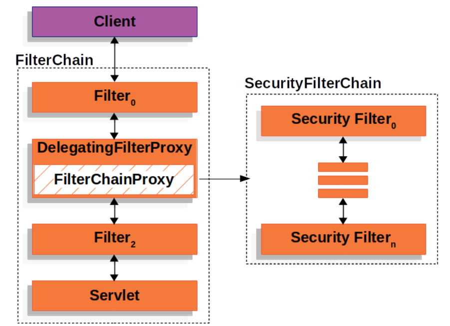 - 웹 요청은 DelegatingFilterProxy라는 객체를 통해 FilterChainProxy로 전달된다.