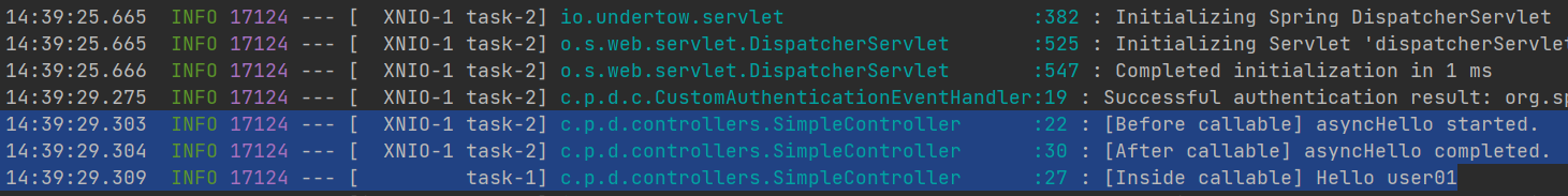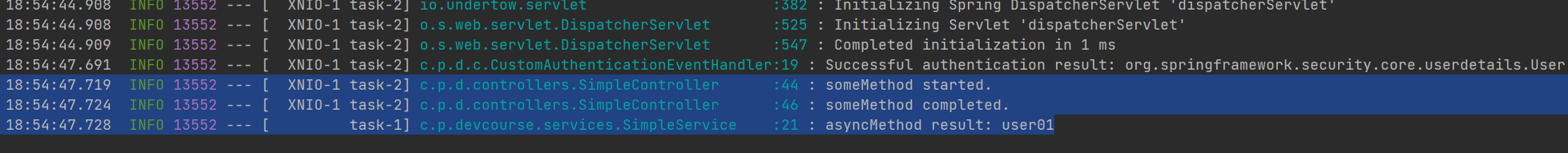 SecurityContext는 ThreadLocal<T> 변수를 이용하고 있고, 따라서 다른 쓰레드에서는 SecurityContext를 참조할수 없어야 한다.WebAsyncManagerIntegrationFilter는 MVC Async Request가 처리될 때, 쓰레드간 SecurityContext를 공유할수 있게 해준다.SecurityContextCallableProcessingInterceptor 클래스를 이용함beforeConcurrentHandling() — HTTP 요청을 처리하고 있는 WAS 쓰레드에서 실행SecurityContextHolder.getContext() 부분은 ThreadLocal<T>l의 SecurityContext 정상적으로 참조한다.ThreadLocal<T>의 SecurityContext 객체를 SecurityContextCallableProcessingInterceptor 클래스 멤버변수에 할당한다.preProcess(), postProcess() — 별도 쓰레드에서 실행@Async 어노테이션을 추가한 Service 레이어 메소드에는 해당 되지 않는다.@Controller