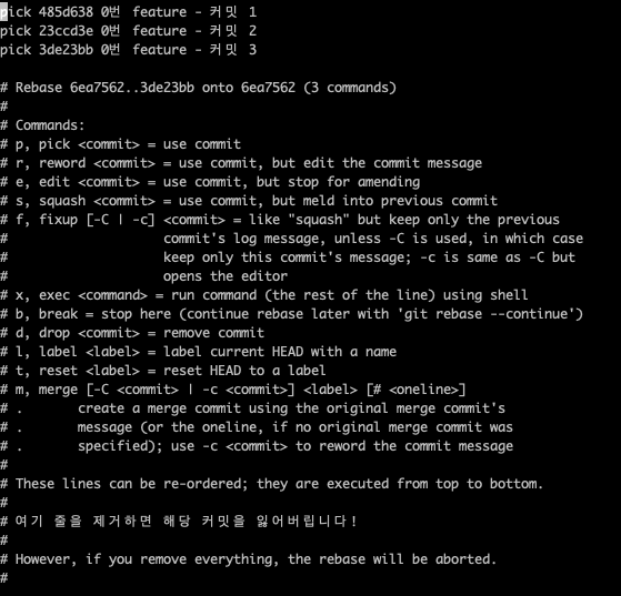 최근 3개의 커밋을 interactive rebase 한다
