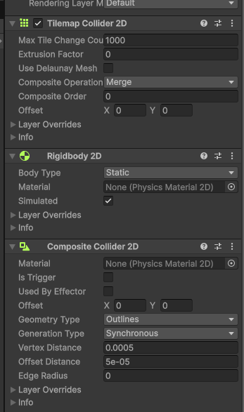 컴포넌트에서 해당 Composite Collider 2D 를 추가해준뒤 Tilemap Collider2D 에서 Operation을 Maege 변경해줍니다.